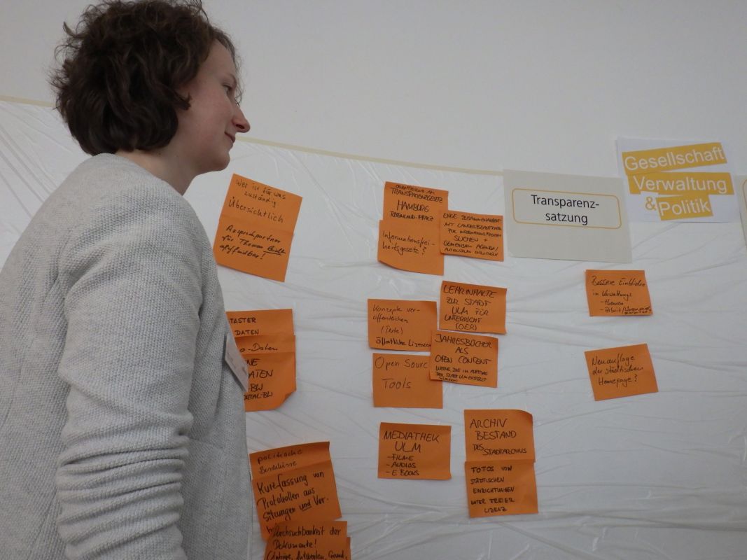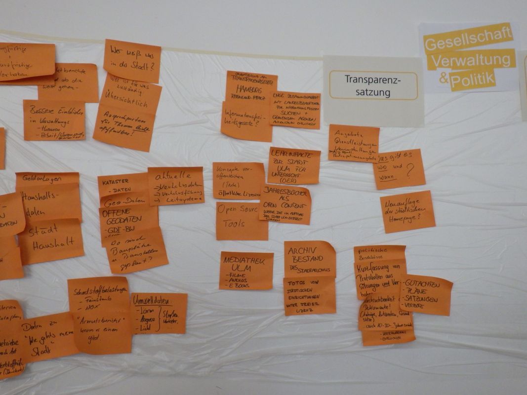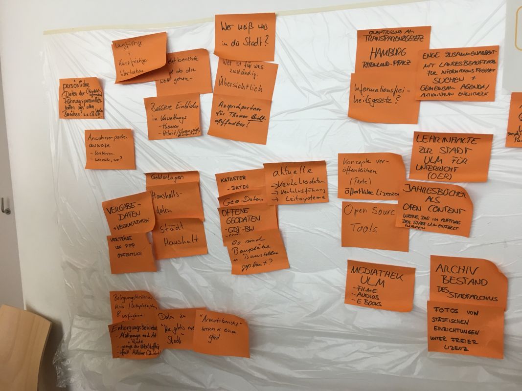 Offenlegung von Kosten und Finanzdaten (Haushalt, Vergabe etc.), Verträge von public private partnerships, Offenlegung Bearbeitungsstand, Information über persönliche Daten, Umweltdaten, Verkehrsdaten, Fallzahlen zu Dienstleistungen, Bauprojekte (Zeitpläne, Kosten, Verzögerungen), Anzahl verfügbarer Parkplätze, Projektberichte, Kitaplätze, Jahresbücher als open conten, Geodaten, Kulturdaten (z.Bsp. Fotos, Archivbestand (Mediathek Ulm)), Wie geht's meiner Stadt, politische Beschlüsse + Protokolle, geplante Baustellen,